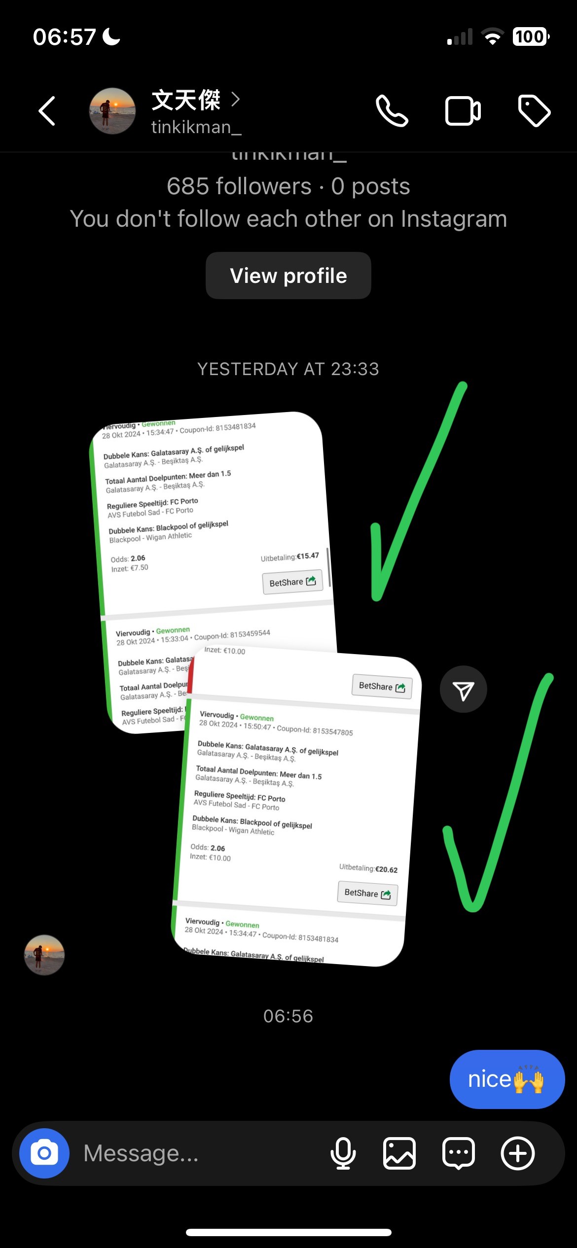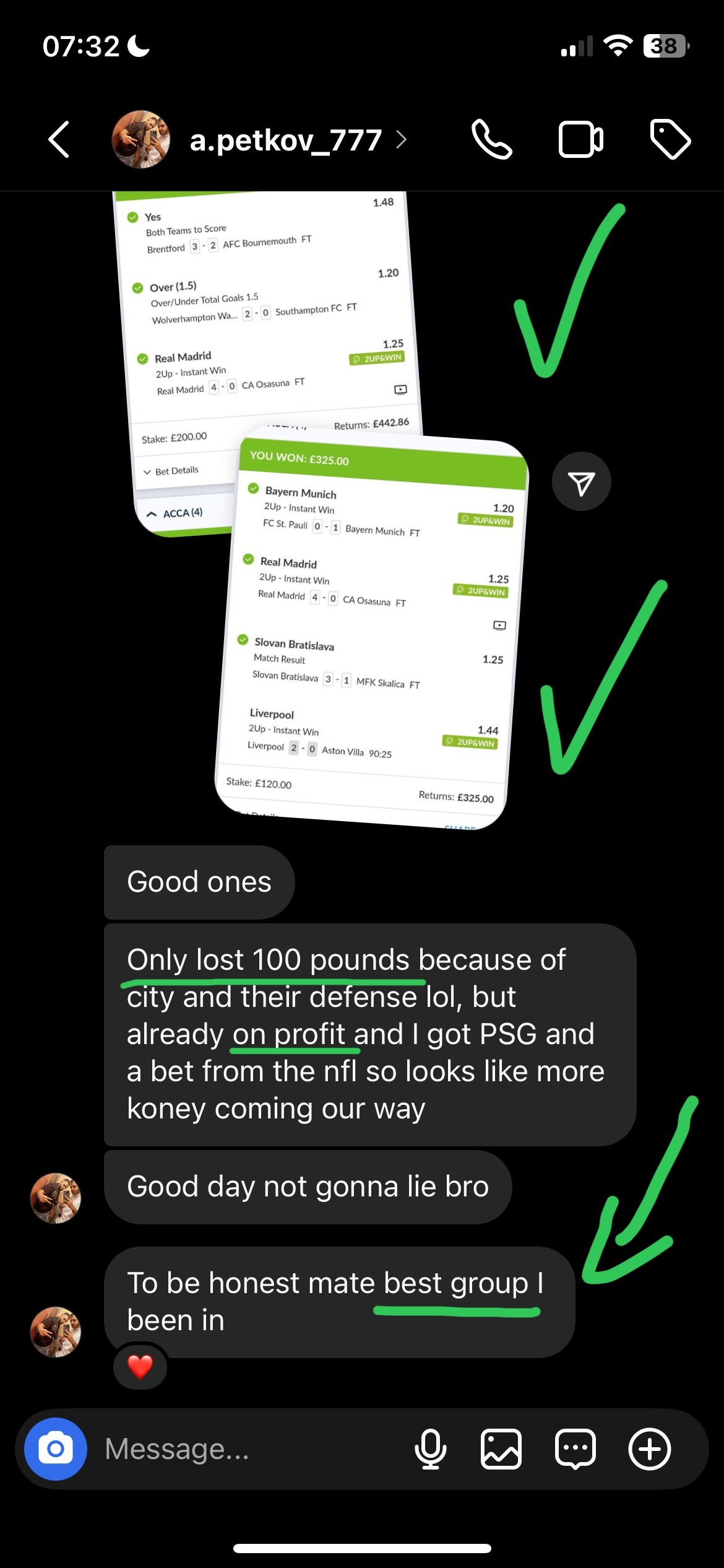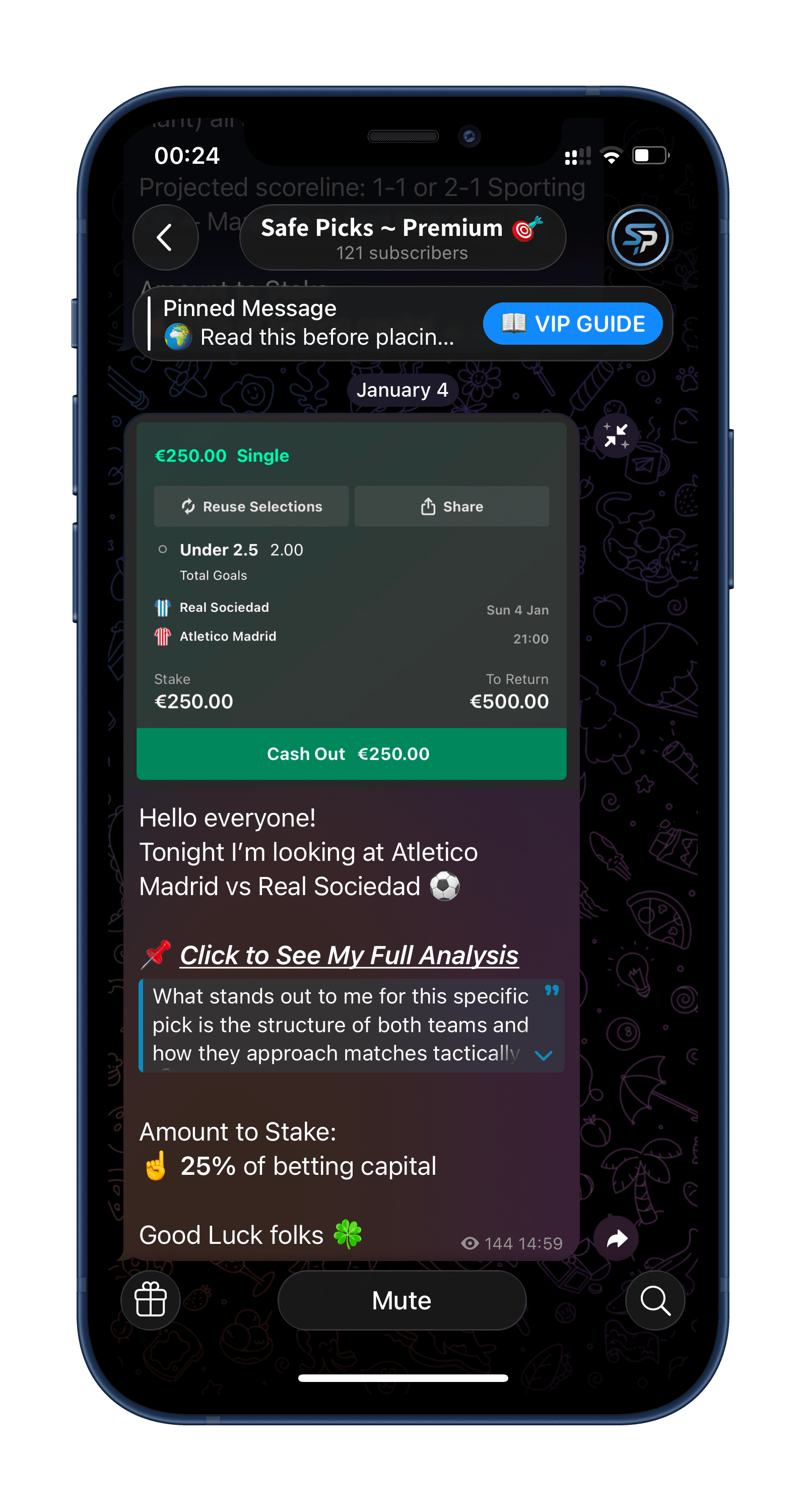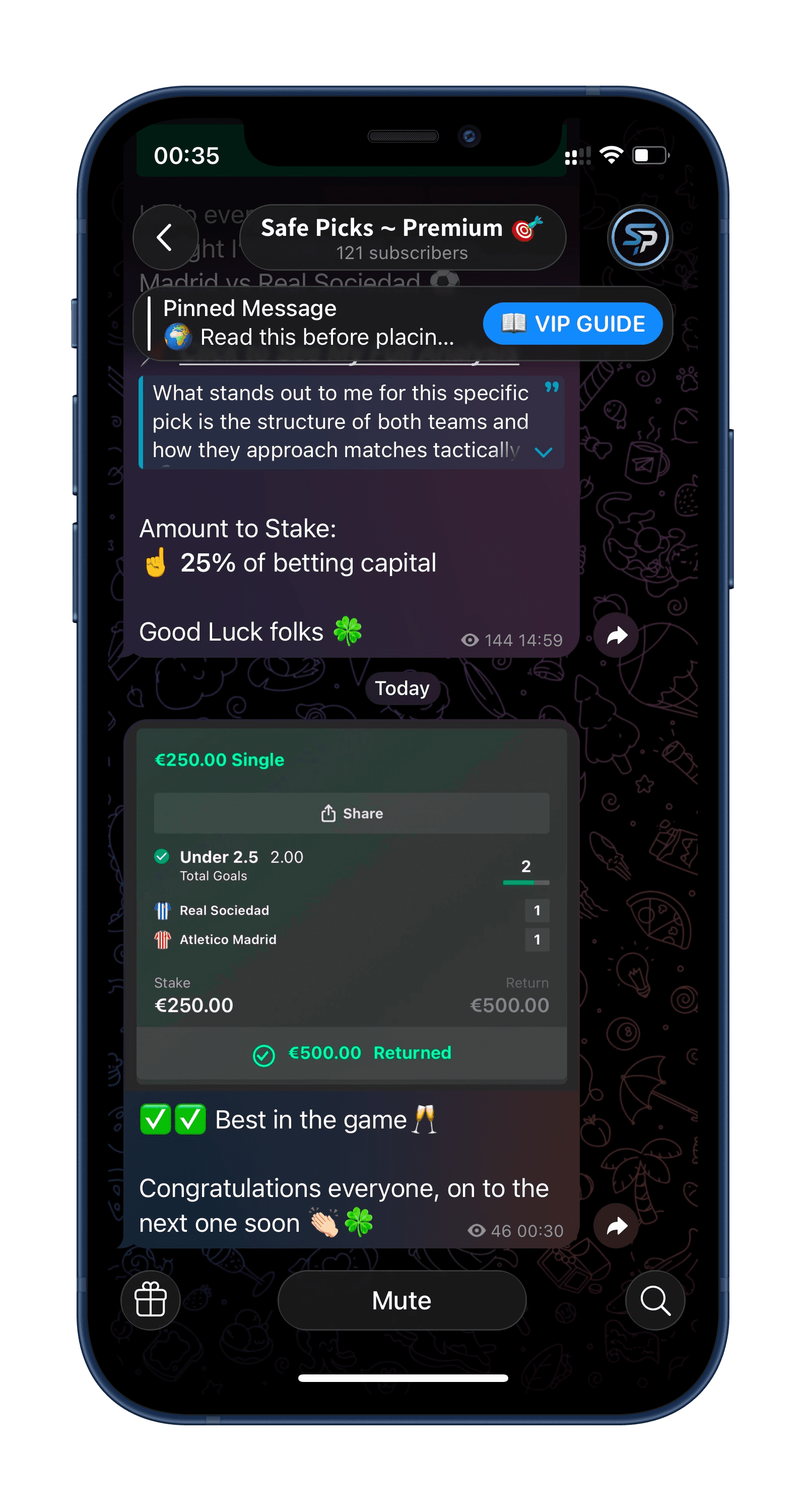 I post carefully selected bets directly in the VIP channel, always shared 6–24 hours before kick-off. Each bet includes the market, odds, stake, and a clear explanation of why i choose to play the bet i have sent.